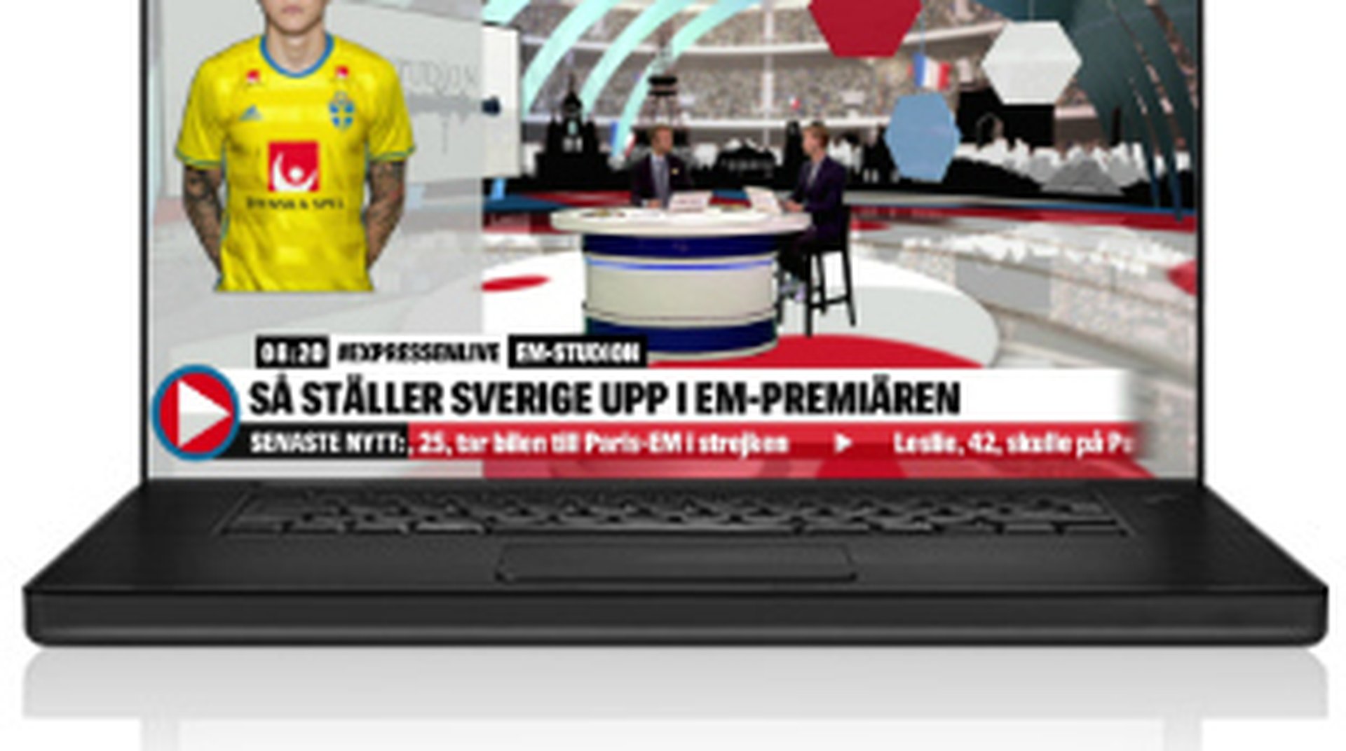 Expressen TV har också en på plats-studio i Frankrike, just nu i Paris inför premiärmatchen men normalt i Pornichet, där det svenska landslaget har sin bas. Videoreportrar bevakar spelarhotellet, alla presskonferenser och träningar samt följer fansens fest.